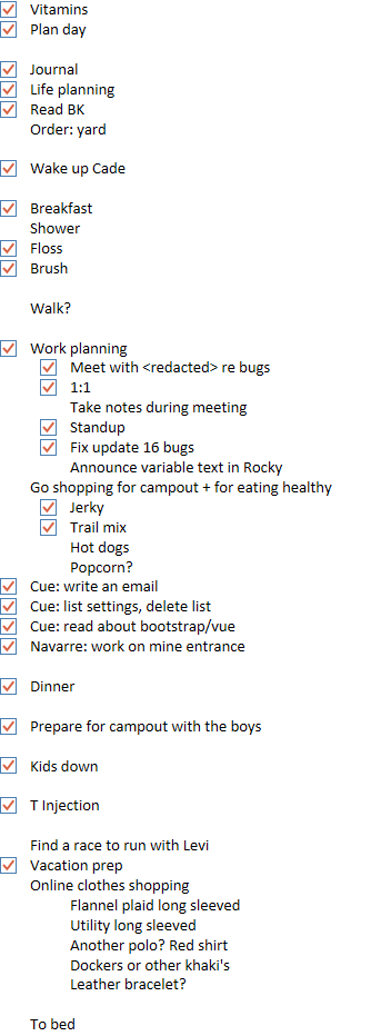 Some other stupid stuff in the plan: showering, brushing my teeth, taking vitamins, putting the kids to bed. All of this would happen with or without including it here.
